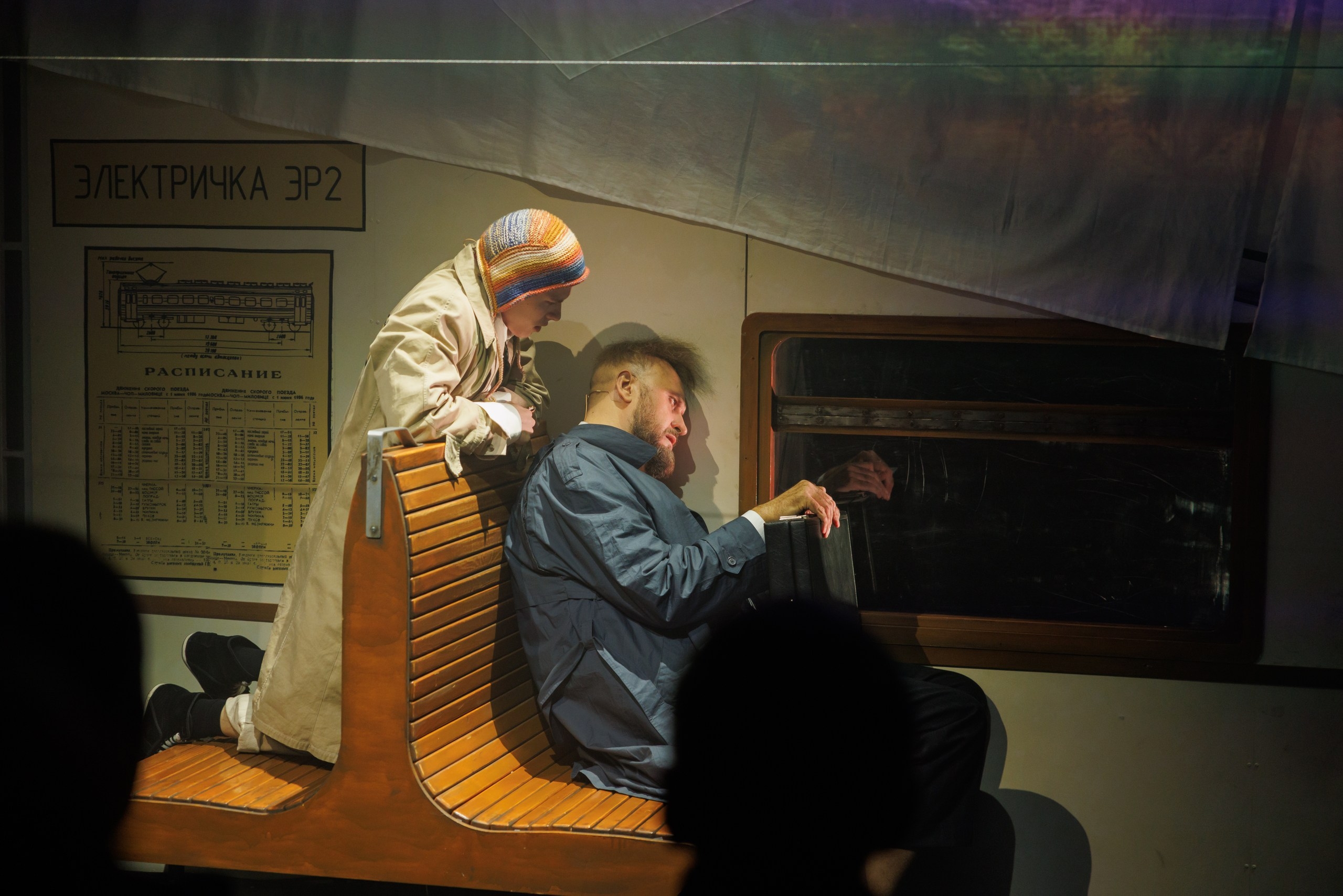Интересную сценографию с многослойным пространством сцены, которое превращается то в электричку, то в ванную комнату. Действие происходит под живой гитарный аккомпанемент, а актёры умело перевоплощаются. Создать атмосферу помогает мэппинг, транслирующий на полотнах убегающие вдаль пейзажи или нарезки популярных телепередач конца советской эпохи — времени, когда во многих «рок-н-рол умер».