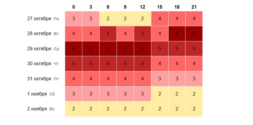 В понедельник, 27 октября, геомагнитное поле будет относительно спокойным. Магнитные бури будут достигать всего четырёх баллов (малая буря). Однако уже во вторник, 28 октября, бури начнут усиливаться. Так, днём ожидается умеренная буря в пять баллов, а вечером сильная — шесть баллов.