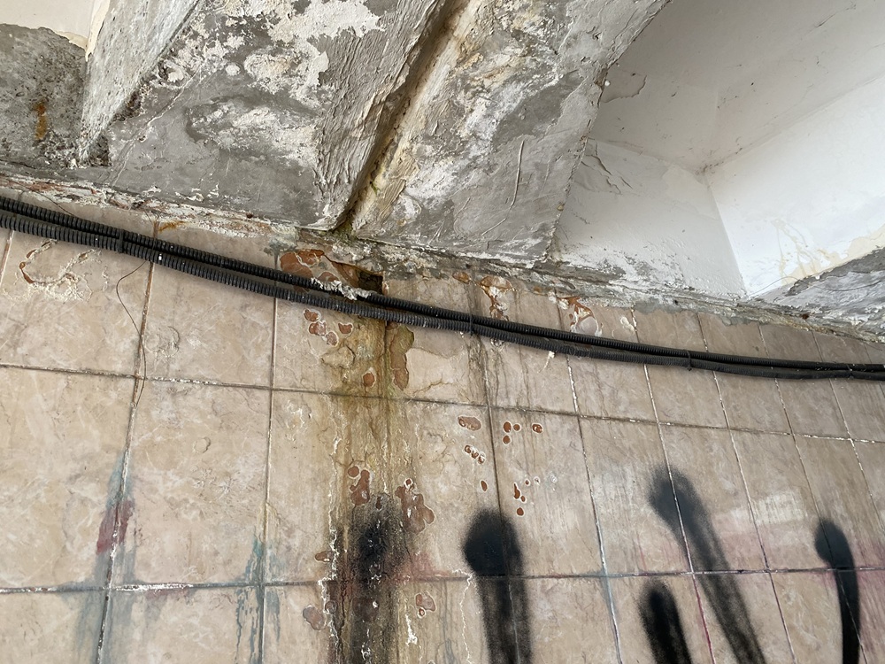 Восторги закончились на пороге. Здесь всё то же, что и на Красномосковской, только в двойном объёме. Кафель выбит, штукатурка осыпалась, от потолка по стенам тянутся ржавые потёки, болтаются провода. Бонусом идут замусоренные ливнёвки, темнота и даже нацистская символика, которой «украшены» стены. По углам на полу характерные пятна — явно сюда нередко заходят справить нужду.