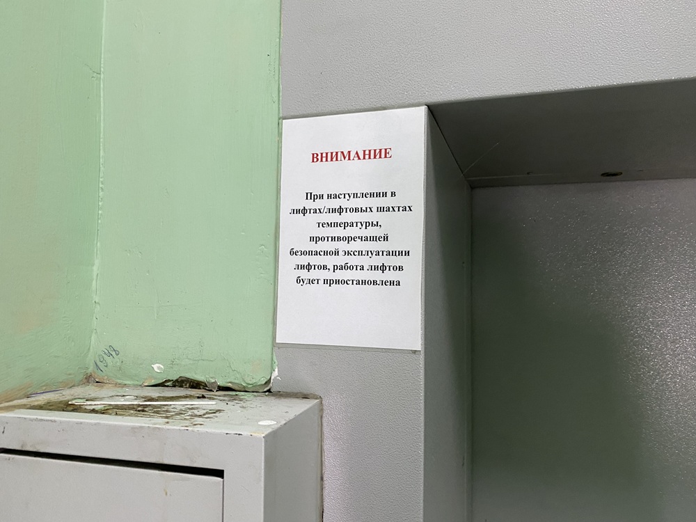 Рядом с подъёмниками есть объявление: «При наступлении в лифтах/лифтовых шахтах температуры, противоречащей безопасной эксплуатации лифтов, работа лифтов будет приостановлена». Мы узнали — диапазон от +5 до +40 градусов. На улице в день «инспекции» было +9. Вероятно, в шахте температура ниже.