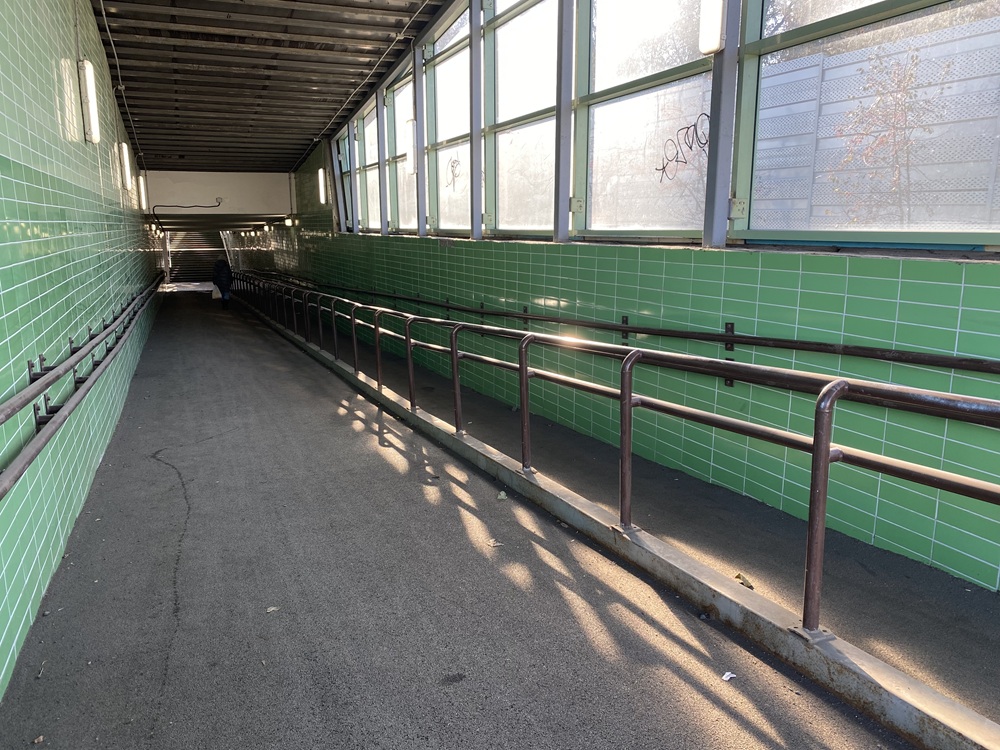 «Как уютно и красиво», — подумали мы на подходе к этой «подземке» со стороны Качи. Осенние кустарники вдоль дорожки, пологий подъём с перилами для колясок, широкая лестница, что-то вроде смотровой площадки-балкончика для отдыха, вход аркой с выложенными полукругом плитами.