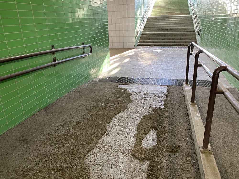 Тусклый свет, битый кафель, грязь, мусор, ржавые потёки, неработающий лифт. В сезон дождей горожане жалуются на подтопление перехода, и факт этот остаётся без внимания.