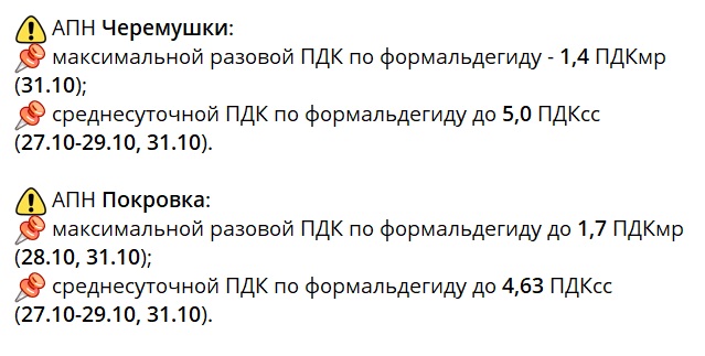 Поводом для инициативы стало загрязнение воздуха в конце октября. Автоматизированные посты наблюдения в Черёмушках и в Покровке зафиксировали, что концентрация формальдегида превышала допустимый уровень в несколько раз.