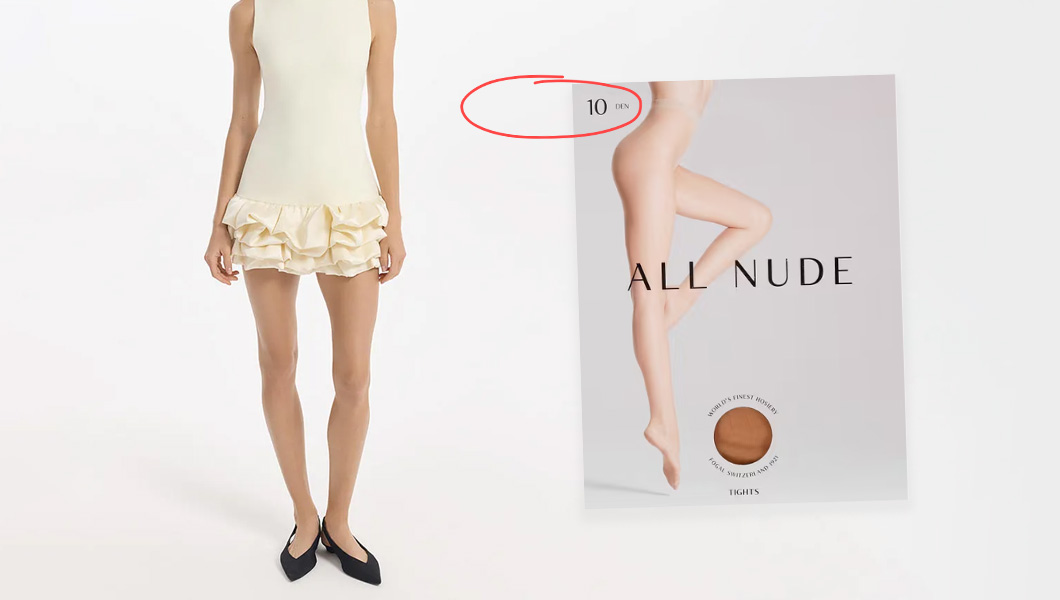 То же касается и сочетания нежного короткого платья с плотными колготками — 40-50 ден. Тяжёлая фактура конфликтует с утонченным силуэтом. Идеально сюда подойдут только тонкие колготки. 7–10 ден максимум.