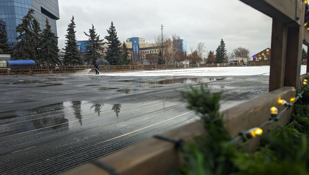 На праздничных выходных на площадке уложили песок, плёнку, утеплитель и айс-маты, а накануне вечером появился первый лёд.