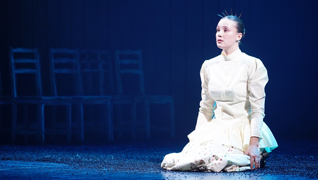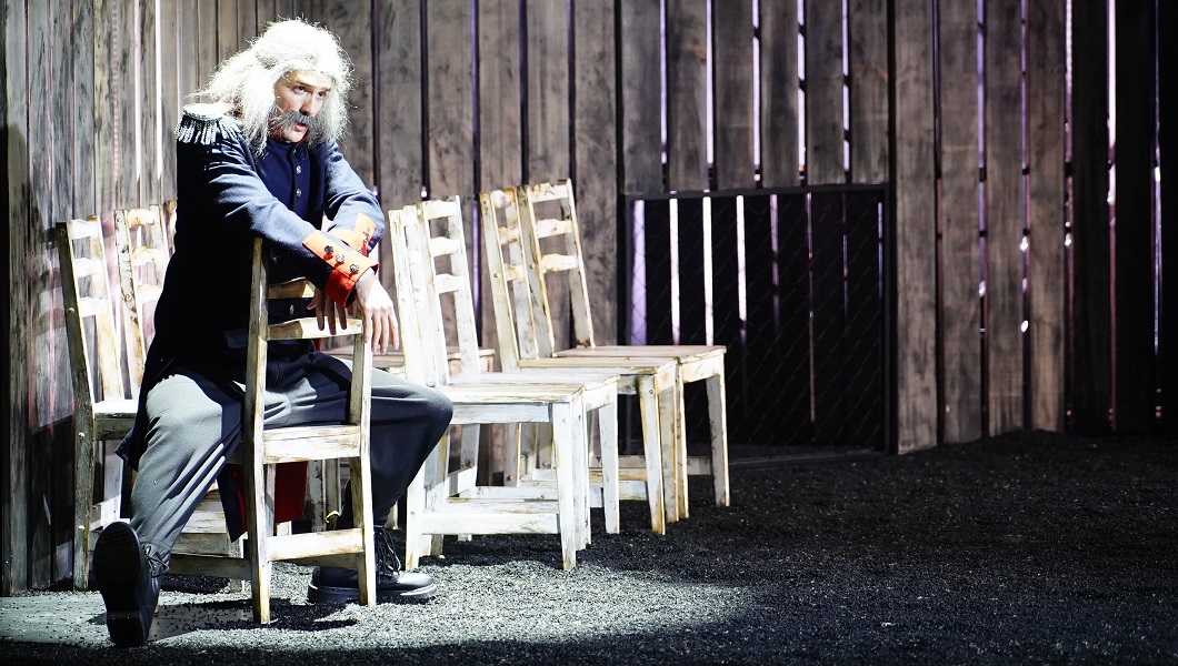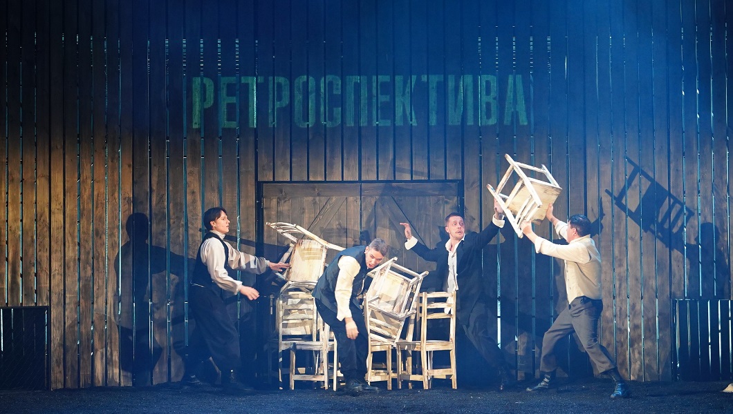 Сцена оформлена аскетично. Кроме фотографий, мы видим только десять стульев и один стол. Алла Васильева мастерски использует этот минимальный набор, чтобы вести зрителей от эпизода к эпизоду.