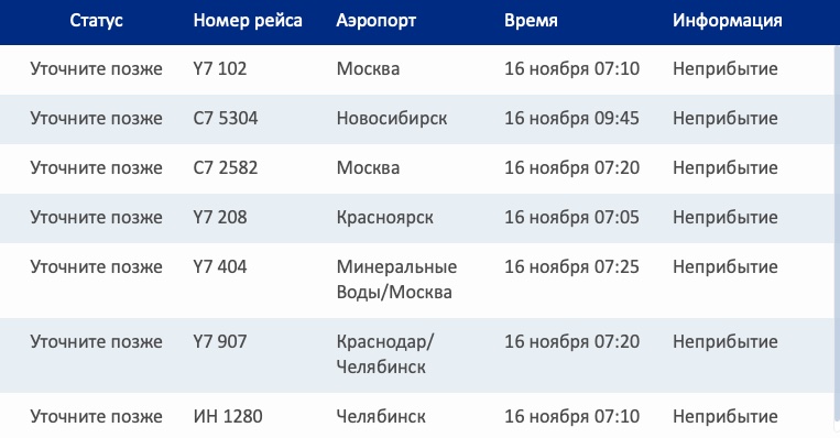 Почти на сутки задержали рейсы в Красноярск, Краснодар, Новосибирск, Москву, Челябинск и Минводы. Их перенесли на 16 ноября.