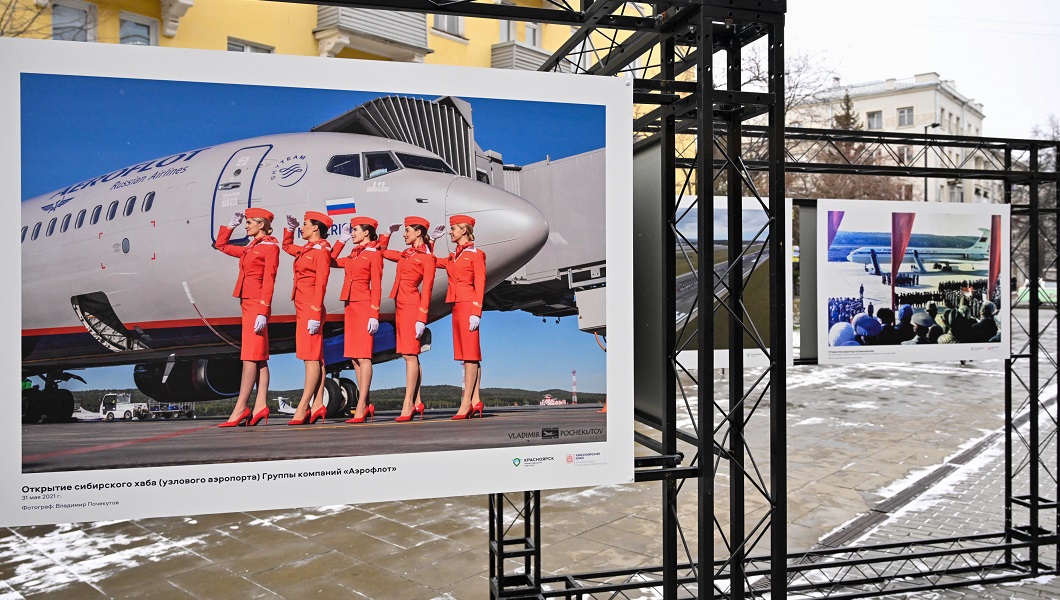 В уличной галерее на Дзержинского появилась экспозиция из трёх частей к юбилею Международного аэропорта Красноярск им. Д.А. Хворостовского.