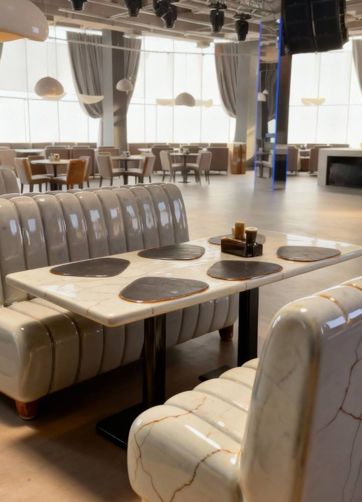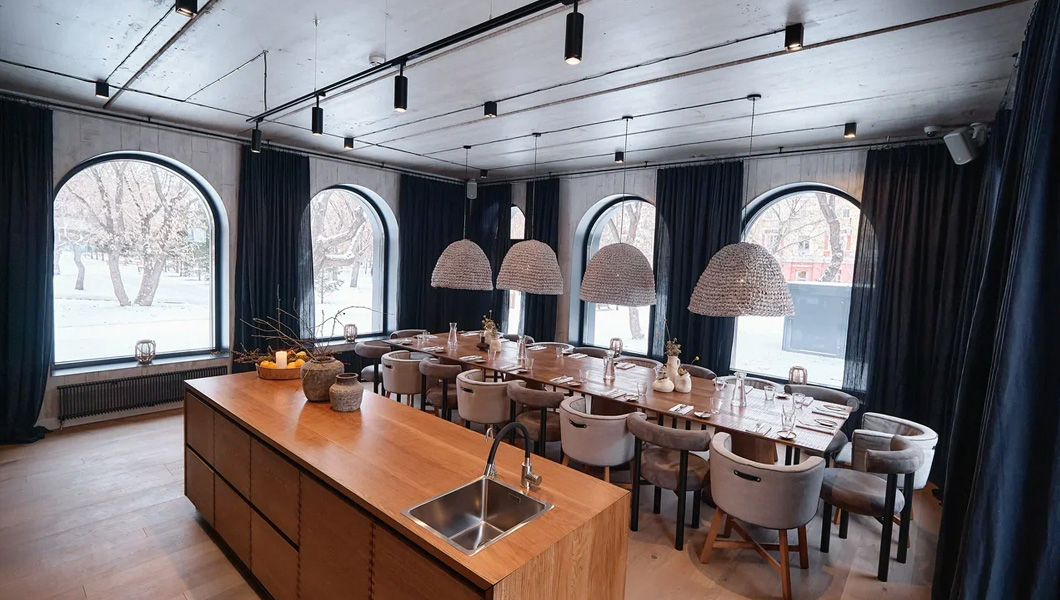 Зал вмещает до 70 человек, однако благодаря мягким тонам в интерьере он сохраняет домашний уют. Поэтому комфортно будет и на камерном ужине, и на празднике с большим коллективом. По желанию рестобар могут закрыть полностью, чтобы ваше торжество прошло в приватной обстановке.