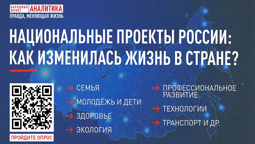 Народный фронт запускает всероссийский опрос о реализации национальных проектов в 2025 году и переменах, которые они повлекли за собой в образовании, здравоохранении, культуре, ЖКХ и других сферах жизни. Пройти его можно по ссылке.