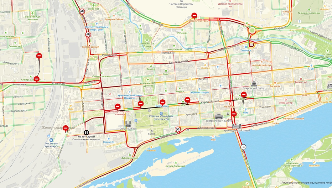 Судя по картам 2ГИС, стоит весь город. Однако хуже всего ситуация в районе Красной площади, на улицах Робеспьера, Маерчака, Брянская, Ады Лебедевой, Дубровинского, Семафорная, Ястынской, Северном Шоссе и проспекте Свободный.