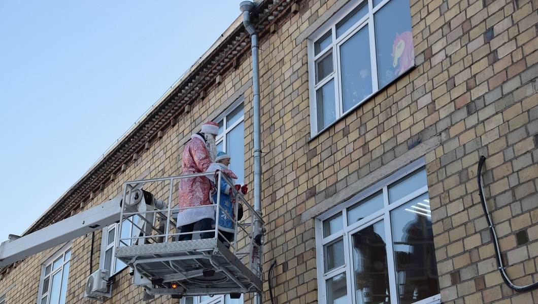 Дед Мороз и Снегурочка поднялись на подъёмнике к окнам палат