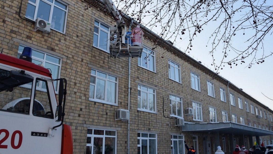 Участники акции нарядили ёлку во дворе больницы, а Дед Мороз и Снегурочка на автоподъёмнике поднялись к окнам палат.