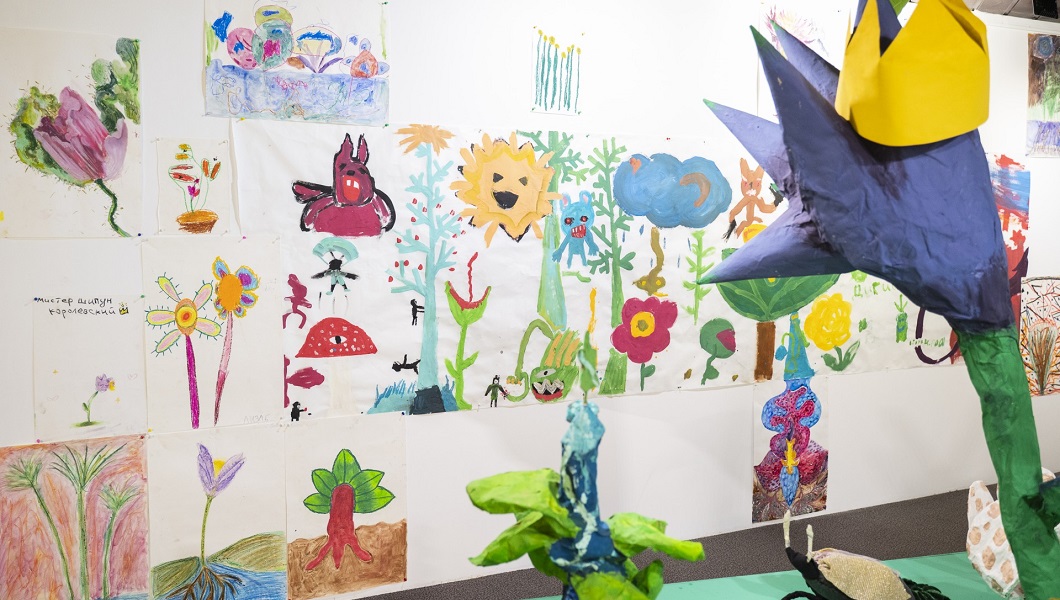 В «Площади Мира» недавно открылась выставка с детским искусством — работы участников Мастерской трогательных дел. Они делали цветы из папье-маше, текстильных насекомых и облака в технике цианотипия.