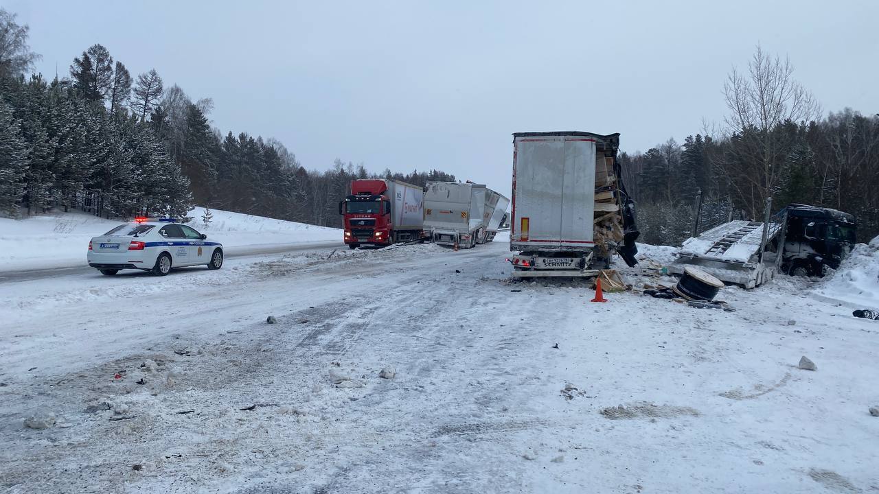По данным Госавтоинспекции, авария произошла на 679 километре — это недалеко от Ачинска. На кадрах видно, что несколько фур полностью перекрыли дорогу. Предварительно, пострадавших нет.