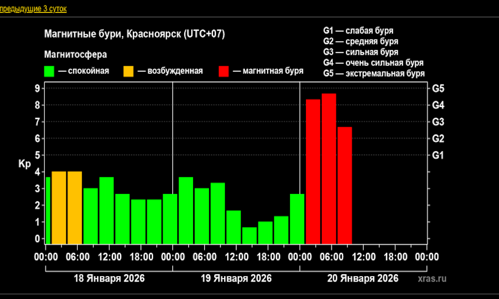 В итоге на Землю обрушилась сильная магнитная буря. Судя по графику, в Красноярске в ближайшие часы возмущения достигнут уровня G5 — экстремальная буря.