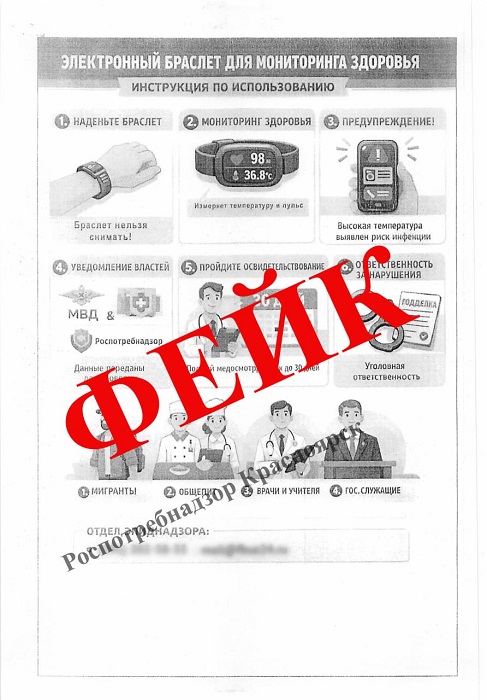— Данные устройства якобы будут передавать информацию в режиме реального времени в Управление Роспотребнадзора по Красноярскому краю. В случае фиксации превышения температуры тела свыше 37,5°С в течение 24 часов человек может быть изолирован. В инструкции по пользованию таким браслетом фигурирует действующий номер телефона горячей линии ФБУЗ «Центр гигиены и эпидемиологии в Красноярском крае». Конечно же, это тоже дезинформация.