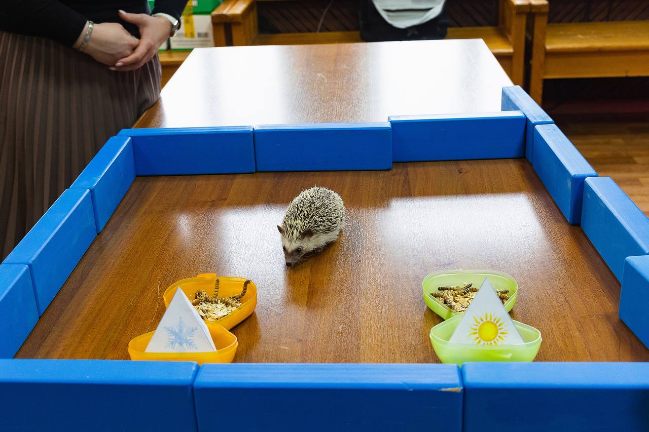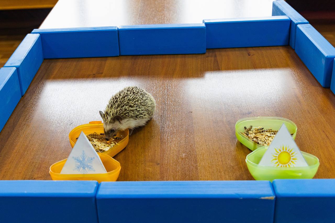 Для колючего предсказателя подготовили две одинаковые миски с любимым деликатесом — личинками жука зофобаса. Порции специально взвесили, чтобы Потап не выбрал миску побольше. Одну поставили под табличку с солнцем — символом ранней и тёплой весны, другую — под снежинкой, что означает затяжную и прохладную весну.