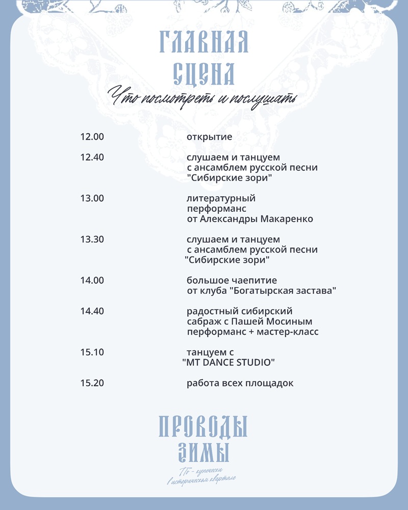 В последний день зимы «Исторический квартал» на Горького, 15 распахнёт свои резные ворота, чтобы попрощаться с этим уже надоевшим сезоном. Проводы будут купеческого размаха: с песнями и перформансами, большим трактирным самоваром, особенной ухой, сбитнем и широким базаром от местных мастеров. Все подробности на фото ниже. Кстати, приветствуются соответствующие купеческой эпохе образы, так что готовьтесь облачаться в шубы, тулупы и павлопосадские платки. Вход свободный
