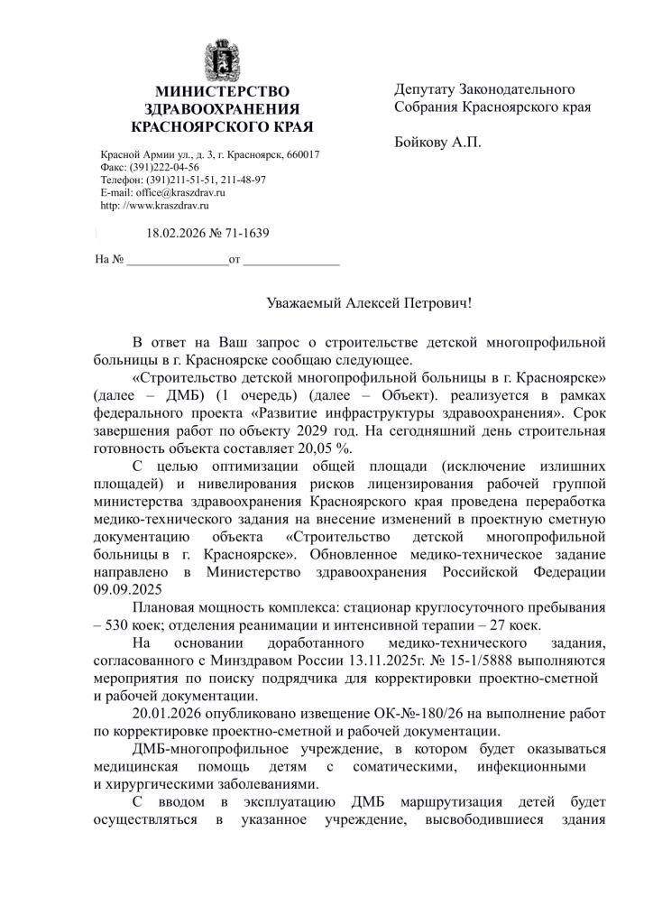 Ввод в эксплуатацию первой очереди детской многопрофильной больницы на Караульной в Красноярске перенесли на 2029 год. Об этом сообщил депутат Заксобрания Алексей Бойков со ссылкой на ответ краевого Минздрава.