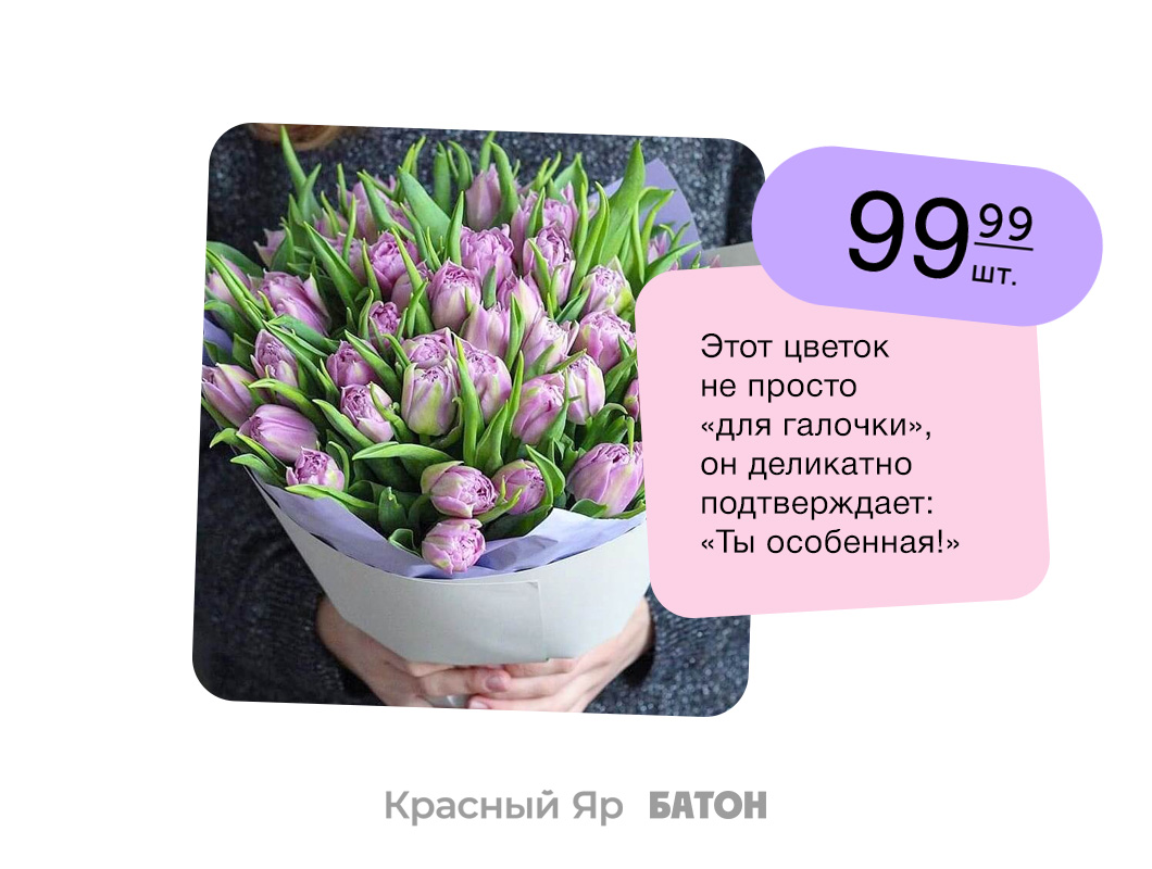 Близится Международный женский день. Как бы ни хотелось, поздравить в одиночку всех женщин мира вряд ли выйдет, зато самых близких и дорогих — точно получится. И начните с главного — цветов! Как выбрать букет, чтобы он передал нужные эмоции, подскажут «Город Прима» и сеть гастрономов «Красный Яр» и дискаунтеров «Батон».