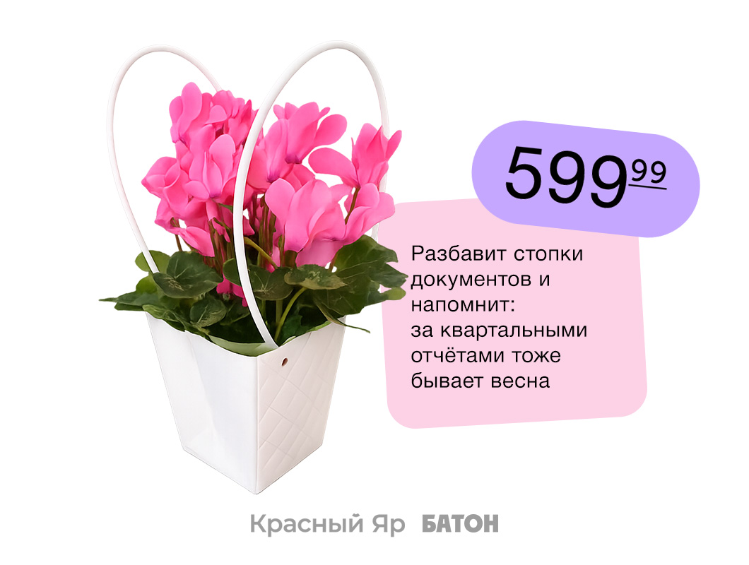 Что подарить человеку, с которым вы проводите треть жизни? Подарок должен быть практичным, но душевным. Цикламен — идеальный выбор: элегантный, не требует сложного ухода и при этом выглядит стильно (как ваша соседка по офису). Этот цветок символизирует: «Я здесь, чтобы сделать офис лучше, но без лишнего пафоса». Горшок с цикламеном разбавит стопки документов и напомнит: за квартальными отчётами тоже бывает весна. А ещё он будет радовать своей красотой и вас тоже.