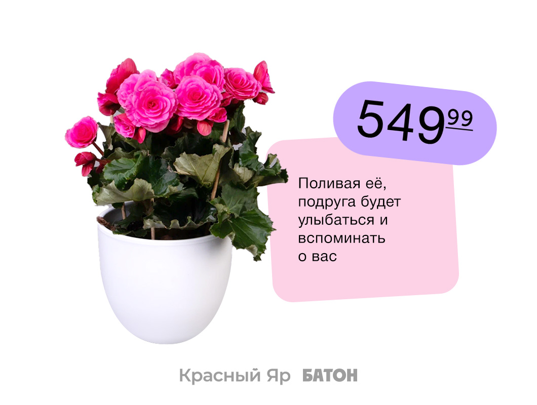 Цветок должен соответствовать вашей дружбе, яркой живой и с множеством оттенков. Лучший выбор — бегония в горшке. Как и настоящий друг, она не капризна, не требует круглосуточного внимания, зато всегда радует своим присутствием и улучшает настроение. Подарите бегонию, и каждый раз, поливая её, подруга будет улыбаться и вспоминать о вас.