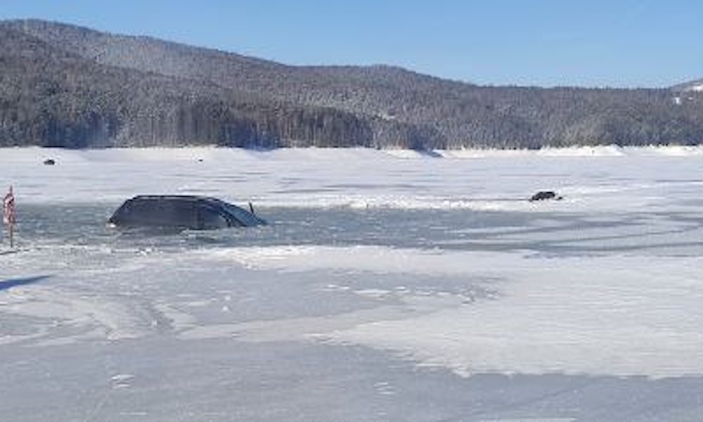 Утром 7 марта два рыбака на автомобиле выехали на Красноярское море. Однако весенний лёд начал трескаться. В итоге машина наполовину провалилась в воду, не доехав до берега.