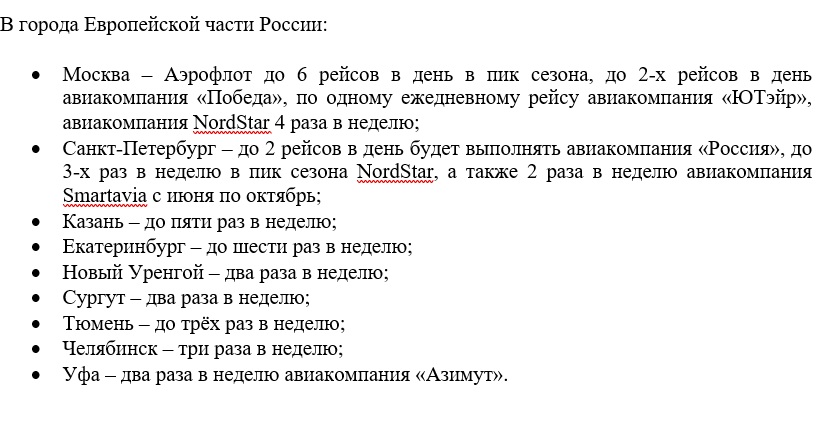 Международные рейсы будут выполняться в 10 стран: Азербайджан, Армению, Вьетнам, Казахстан, Китай, Кыргызстан, Таджикистан, Таиланд, Турцию, Узбекистан.