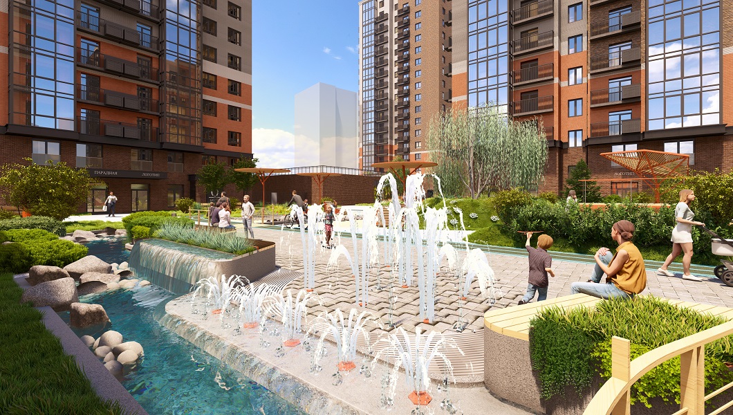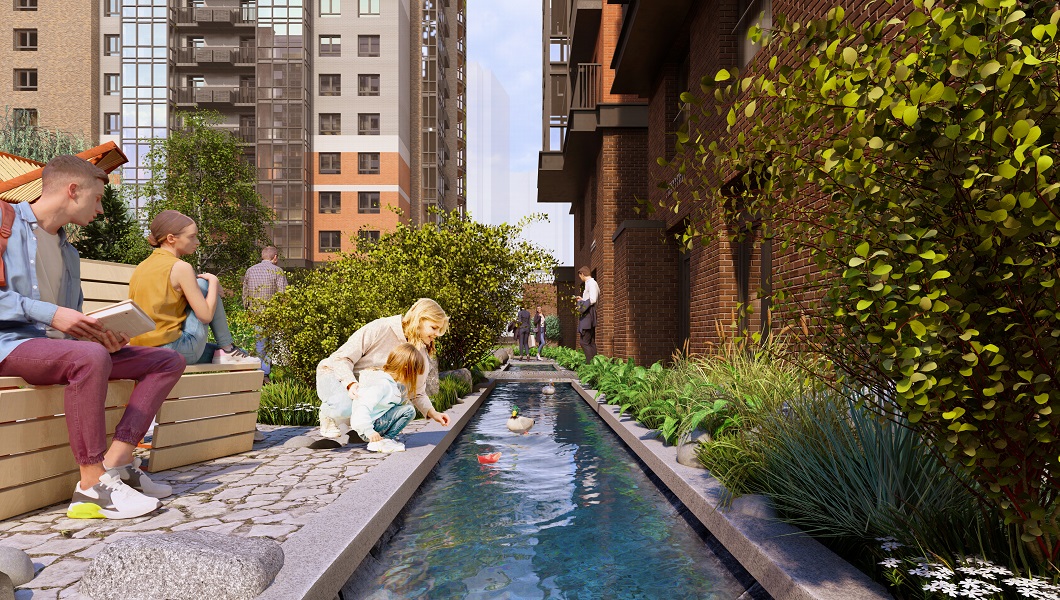 «Речной» расположится всего в 220 метрах от Енисея, а доминантой квартала станет искусственная река протяженностью 315 метров, которая будет протекать по территории закрытого двора и станет местом притяжения для всех жителей.