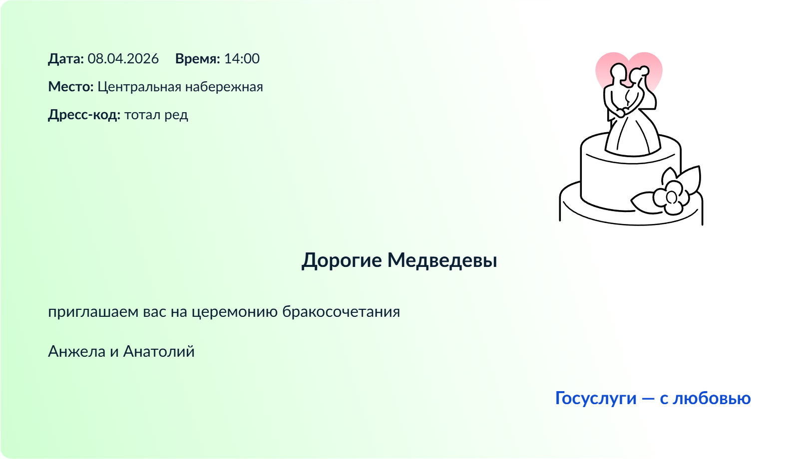 Чтобы создать приглашение. откройте раздел «Приглашение на свадьбу» на портале Госуслуг. Выберите подходящий цвет и дизайн приглашения из галереи шаблонов, заполните обязательные поля: имена жениха и невесты, дату, время и место проведения торжества, дресс‑код и текст приглашения.