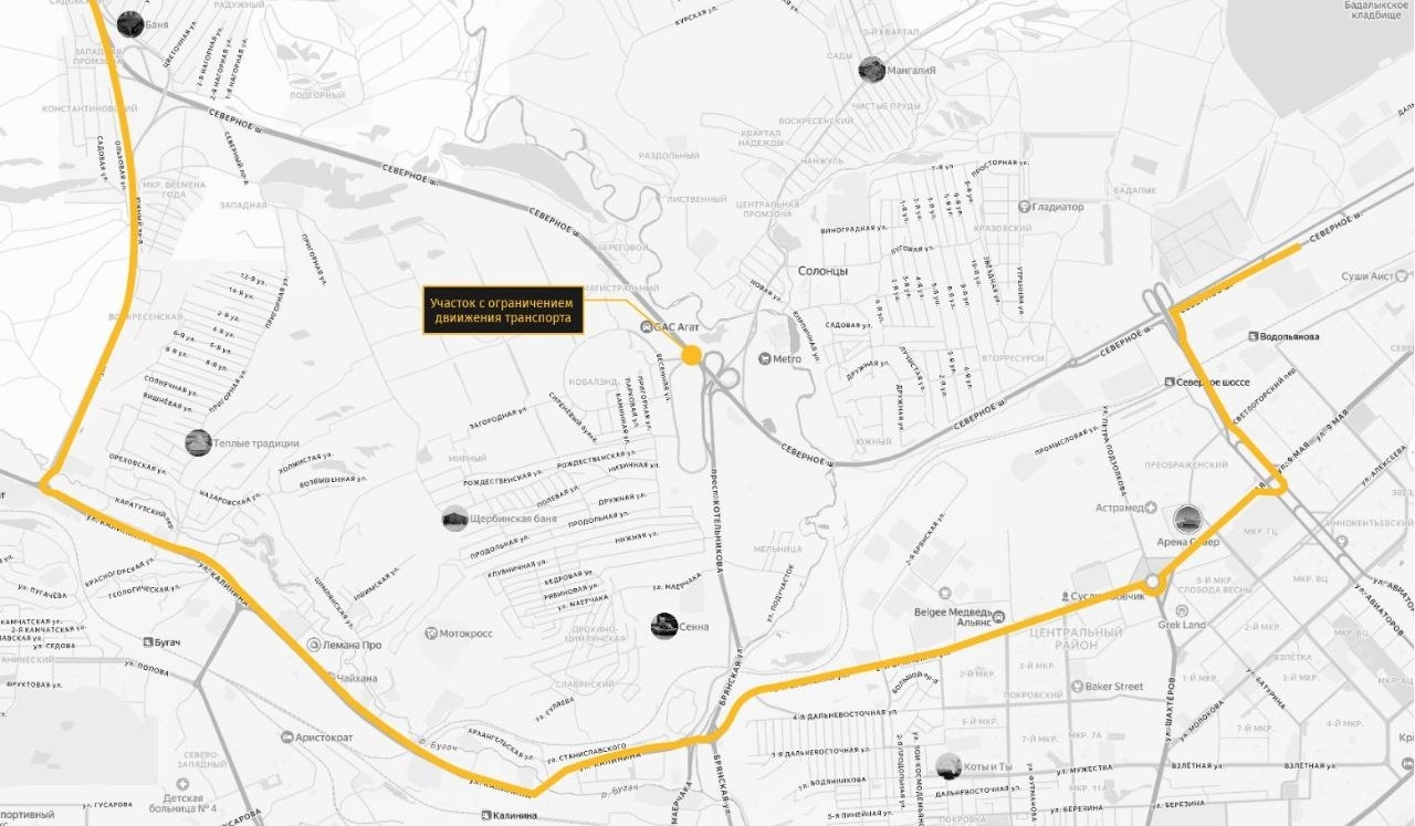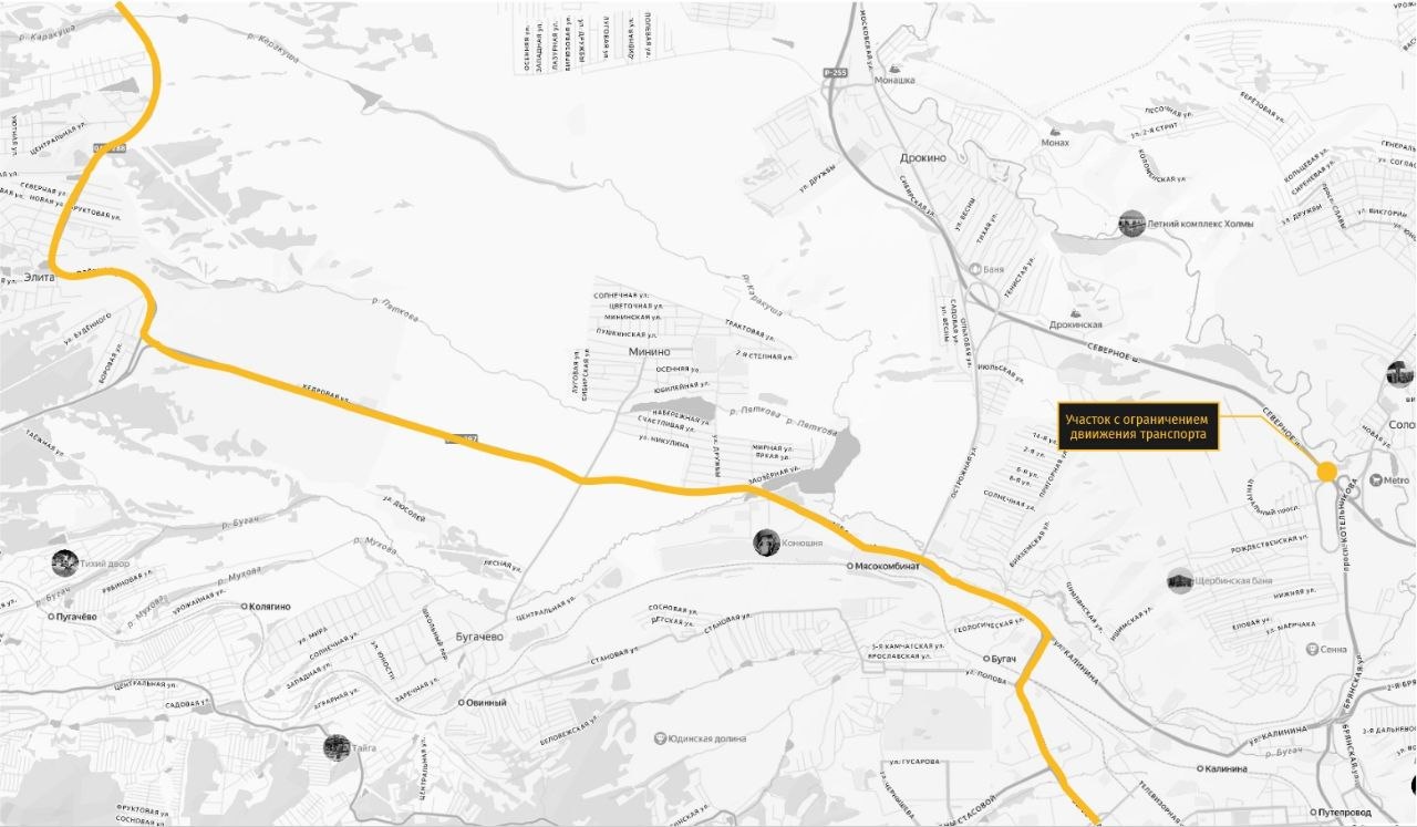 — Альтернативный маршрут движения — проезд по улицам Авиаторов, 2-я Брянская и Калинина. Также в качестве возможного варианта — проезд по трассам Красноярск — Элита и Еловое — ст. Минино, в сторону международного аэропорта Красноярск имени Д. А. Хворостовского.