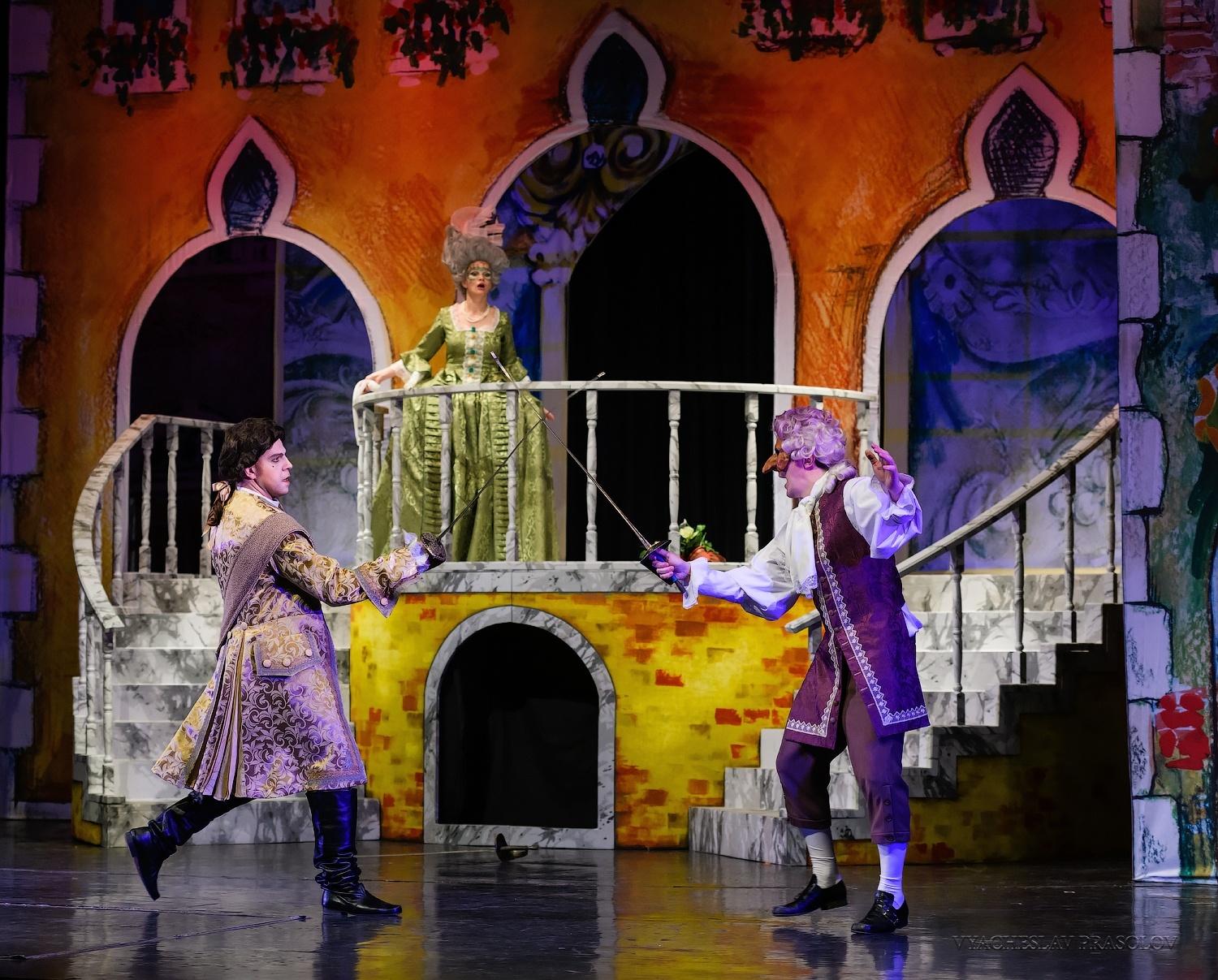 «Венецианские близнецы» – это типичная комедия дель арте, легкая и изящная, с незамысловатым сюжетом. Два брата-близнеца, не знающие друг о друге, попадают в Верону, где их ждут невесты, которые, в свою очередь, не подозревают, что перед ними не один их избранный, а двое. Это вносит такую путаницу в жизнь обитателей Вероны, что каждая минута становится непредсказуемой. Дуэли, пощечины, драгоценности, нелепые ошибки, безумная любовь и коварное злодейство захлестнут зрителя, закружат и закончатся пышными и яркими свадьбами. Много музыки, песен, танцев, венецианские маски и настоящие сражения на шпагах, интриги и легкий юмор подарят положительное настроение надолго.