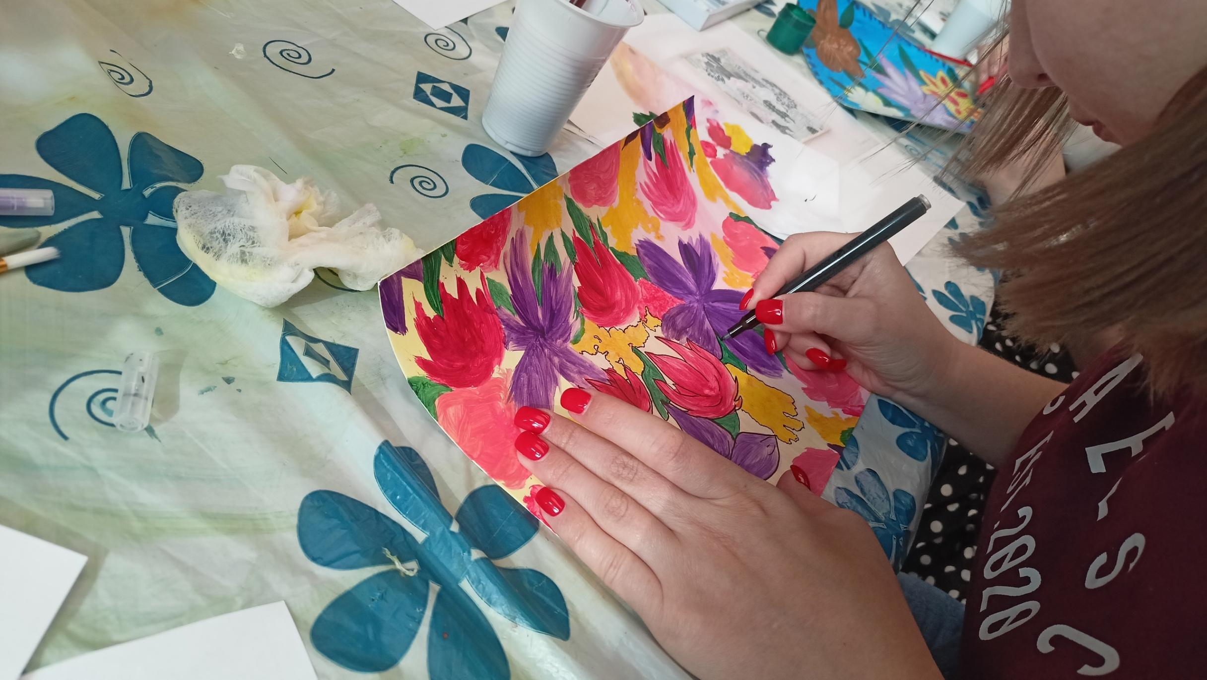 Из материалов потребуются лишь холсты, акриловые краски, акриловый маркер и немного фантазии. На плотной бумаге красками участники сделают набросок цветочной композиции на свой вкус, а затем на подсохшем рисунке маркером дорисуют детали: лепестки, стебли, листья, шипы. В результате получится яркое полотно, создающее летнее настроение.