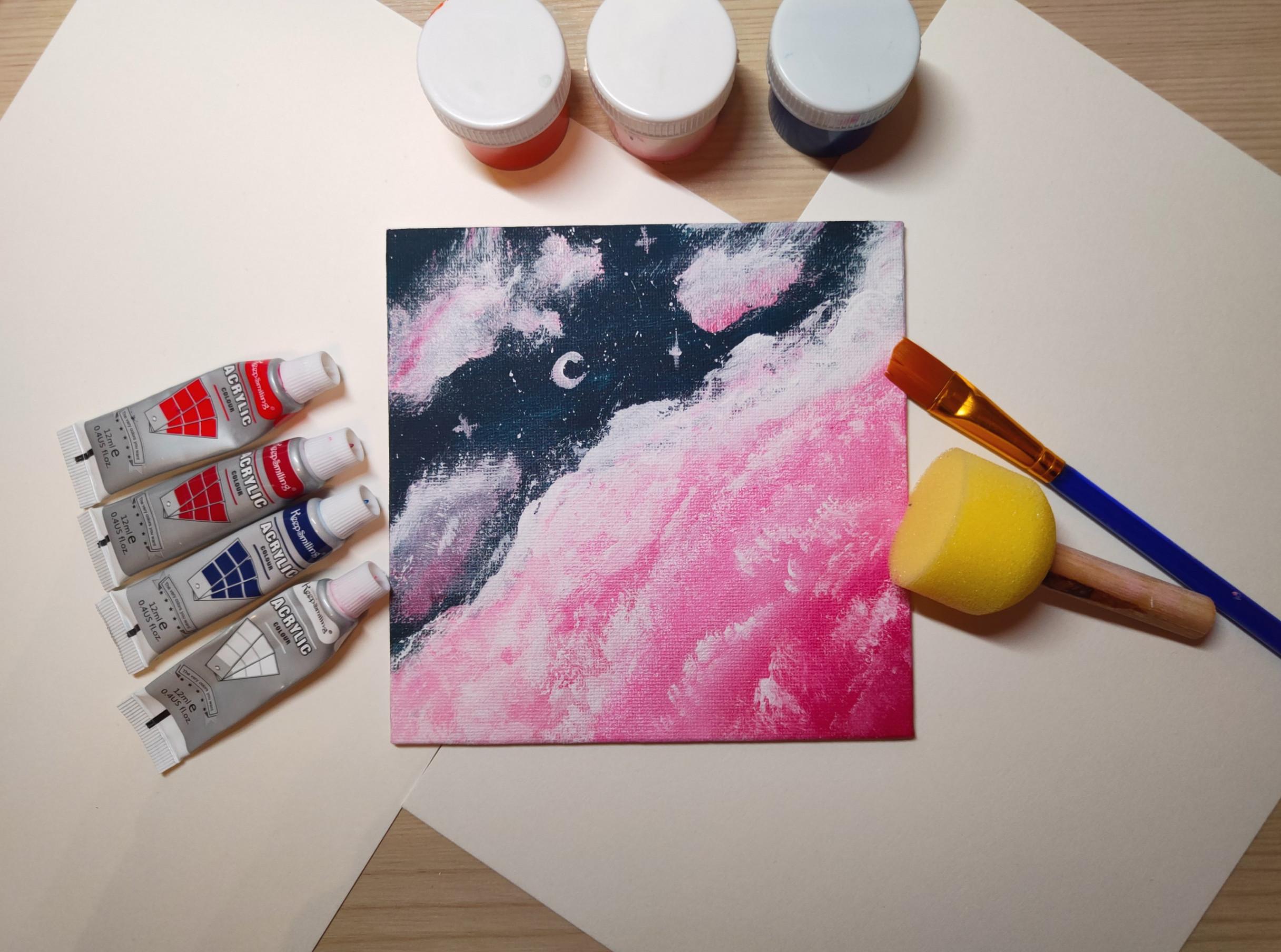 Хотите передать свои впечатления от красивого небесного пейзажа, но не знаете как? Предлагаем простой способ изобразить облака с помощью подручных материалов, доступный даже начинающим художникам. Участники нарисуют вечернее небо, используя лишь несколько цветов акриловых красок, кухонную губку и кисточку. На небольшом подготовленном холсте губкой сделают очертания облаков разными оттенками розового, а затем детализируют рисунок кистью. В результате получится оригинальная картина для подарка или украшения дома.