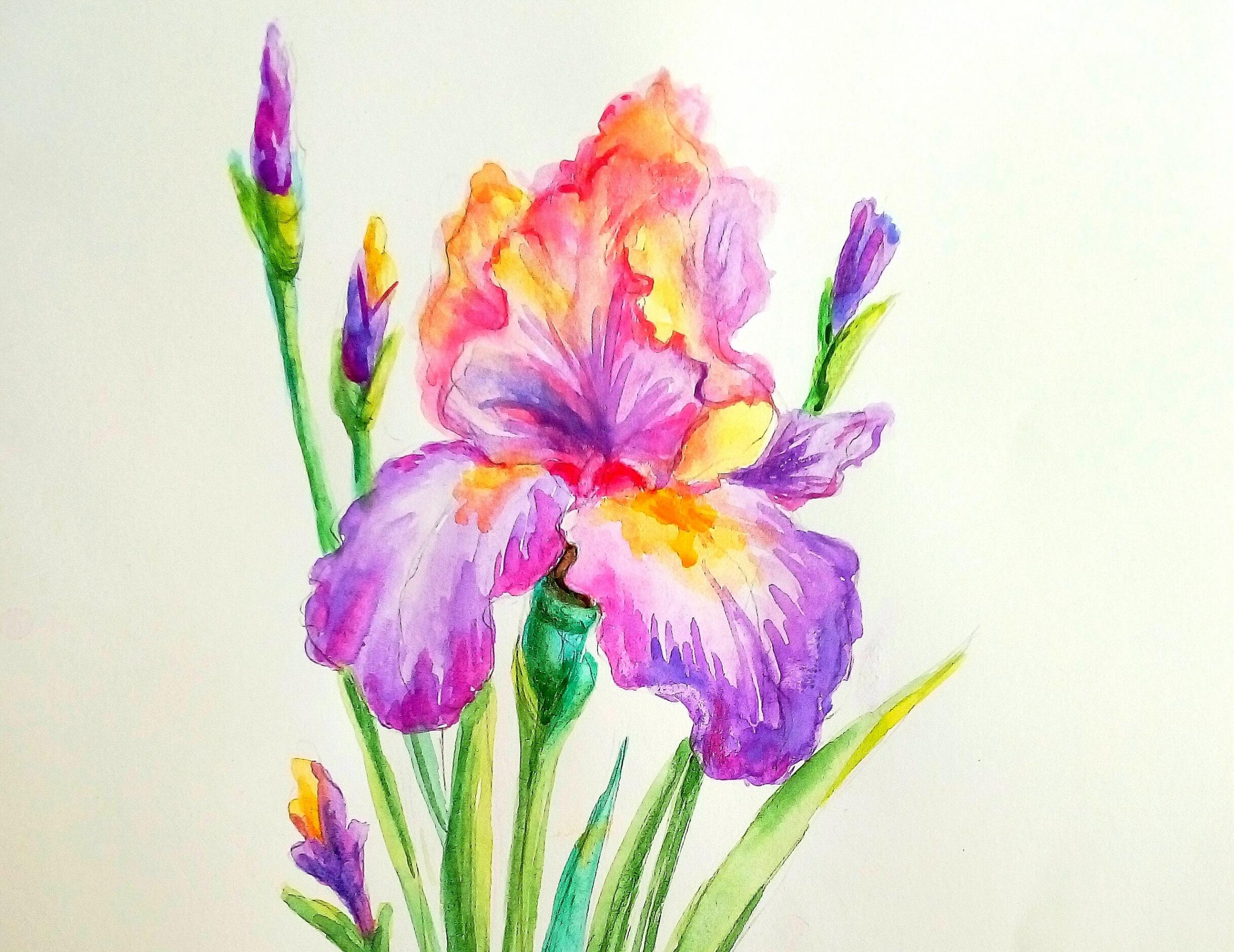 Картина «Ирис» написана акварелью в технике лессировки. Используется многообразие цветов и оттенков. Желтый и охристый плавно перетекают в розовый, нежно-сиреневый и насыщенно-фиолетовый. Первый слой краски самый светлый, прозрачный, после его высыхания добавляется следующий слой, прорисовываются тени, расставляются акценты, благодаря чему цветок становится объемным.