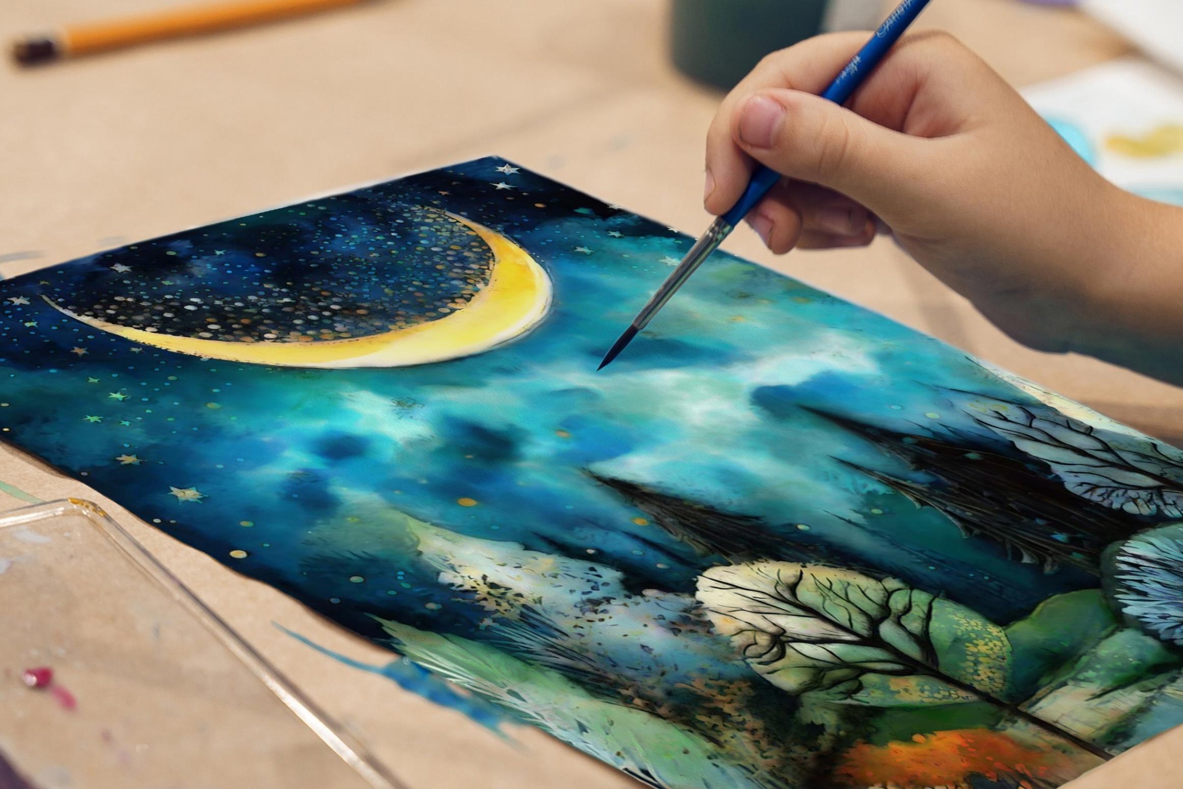 Дети на занятиях в музее осваивают разные техники и материалы, в этот раз попробуют рисовать акварелью. Участники мастер-класса познакомятся с основами работы с акварелью, научатся смешивать цвета на палитре и создадут свою иллюстрацию с таинственным лесом.