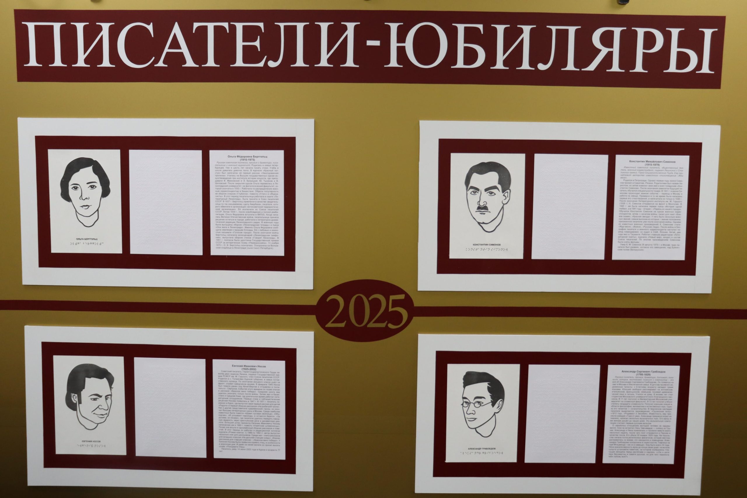 стенде экспозиция посвящена четырём разным писателям-юбилярам нынешнего года. В
