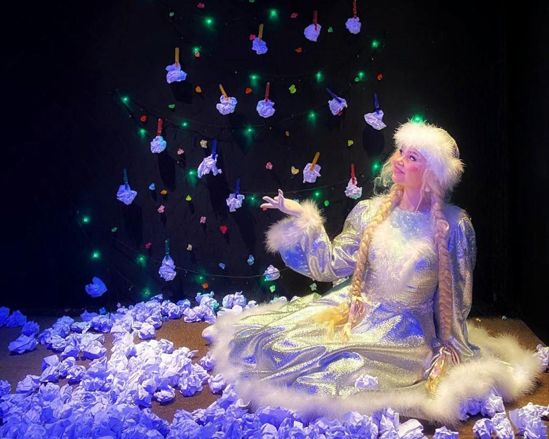 В финале спектакля Дед Мороз, Снегурочка и сказочные персонажи играют с детьми со сцены.