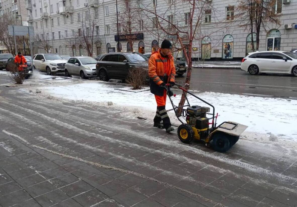 Красноярские коммунальщики показали, как справляются с заснеженными тротуарами