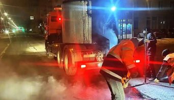 По ночам выбоины чинят литым асфальтом