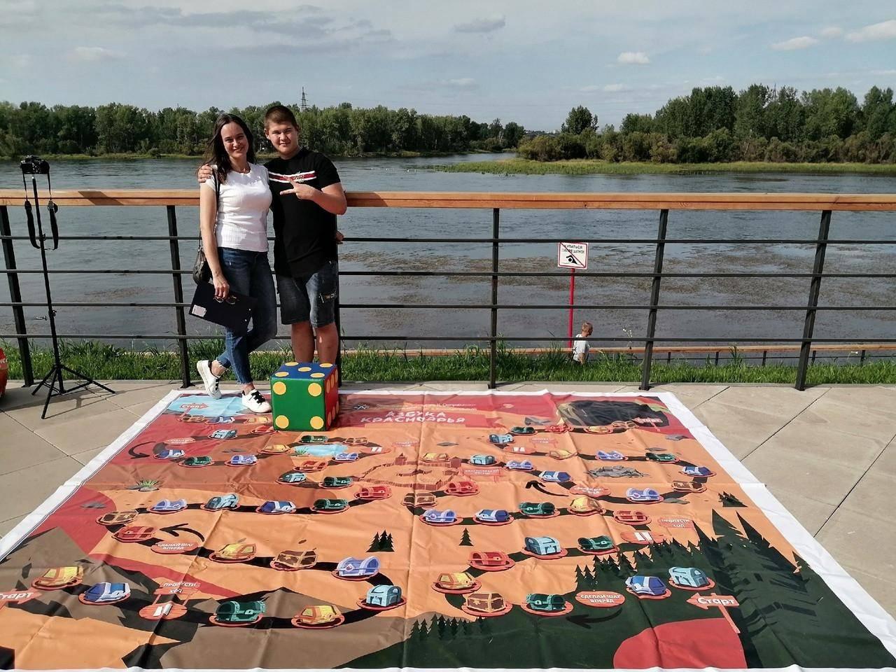 «Прогулки по Красноярью» – это игра-ходилка на знание истории Красноярского края и города Красноярска. Она имеет напольный формат. Участники кидают кубик, передвигают фишки по полю и по очереди отвечают на вопросы ведущего. Одновременно в соревновании могут принять участие либо четыре команды, либо четыре человека. Суть игры – первым добраться до острога, что расположен в центре игрового поля.
