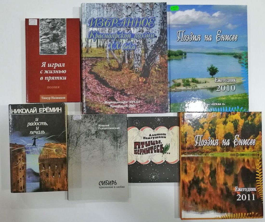 Книжная выставка «Поэты с берегов Енисея» посвящена красноярским авторам, известным и не очень, воспевающим красоты Сибири.