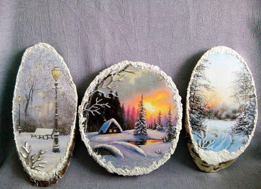 В давние времена считалось, что кусочки дерева – это амулеты, которые оберегают своихвладельцев от несчастья и подпитывают их энергией. Все деревянные изделия содержат в себеживительную силу. Спил, обрамленный корой – прекрасная основа под живопись, а мини-картина на спиле послужит амулетом на счастье, украшением интерьера и просто хорошим подарком.