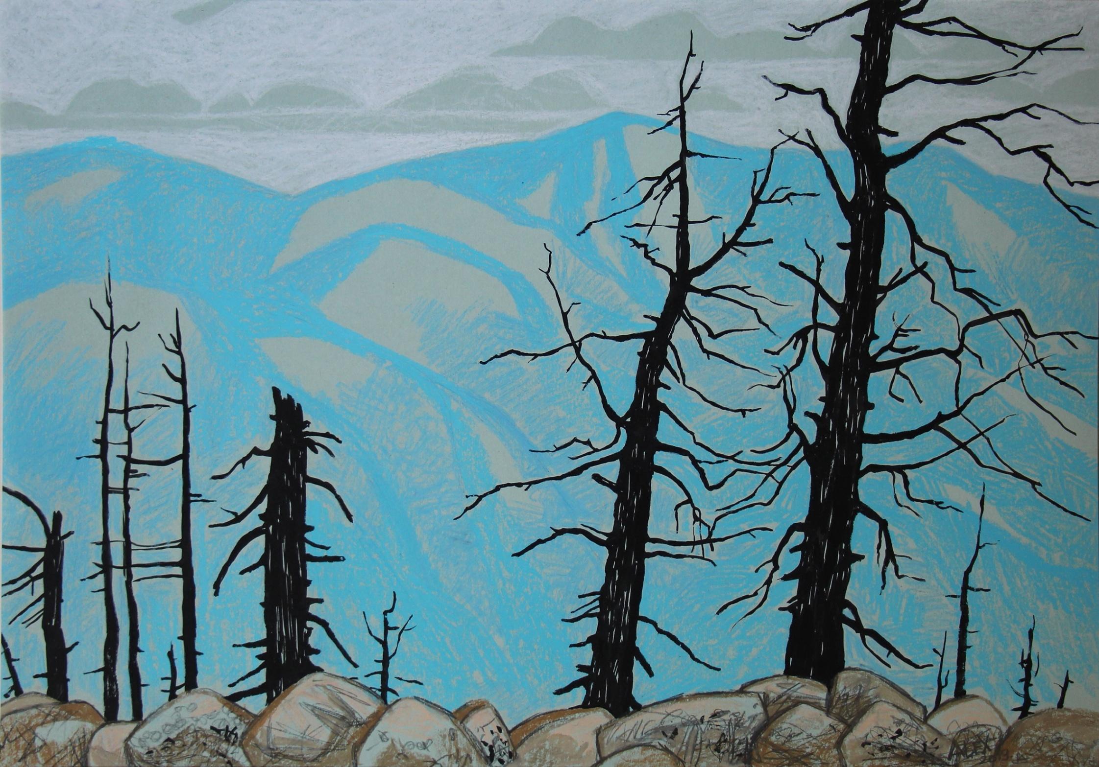 В цикле «Тишина» она соединяет графические техники (линогравюра)с живописными медиа (сухая пастель, темпера, гуашь), создавая минималистские, чётко выстроенные пространства, где город, природа и быт становятся архетипами времени. На работах Александры тишина обретает форму и содержание. Простые предметы — дерево, камни на берегу, отражение неба на стене, снежный горизонт — превращаются в символы внутреннего баланса, памяти и присутствия здесь и сейчас. Чёрно-белые и двуцветные плоскости графики подчёркнуты лаконичностью цвета и точностью штриха, что усиливает ощущение безмятежности и контроля над хаосом современного дня. В каждой работе автор подталкивает зрителя остановиться, всмотреться и увидеть не просто изображение, а состояние — тишину, которая становится мостом между телом зрителя и текстурой мира.