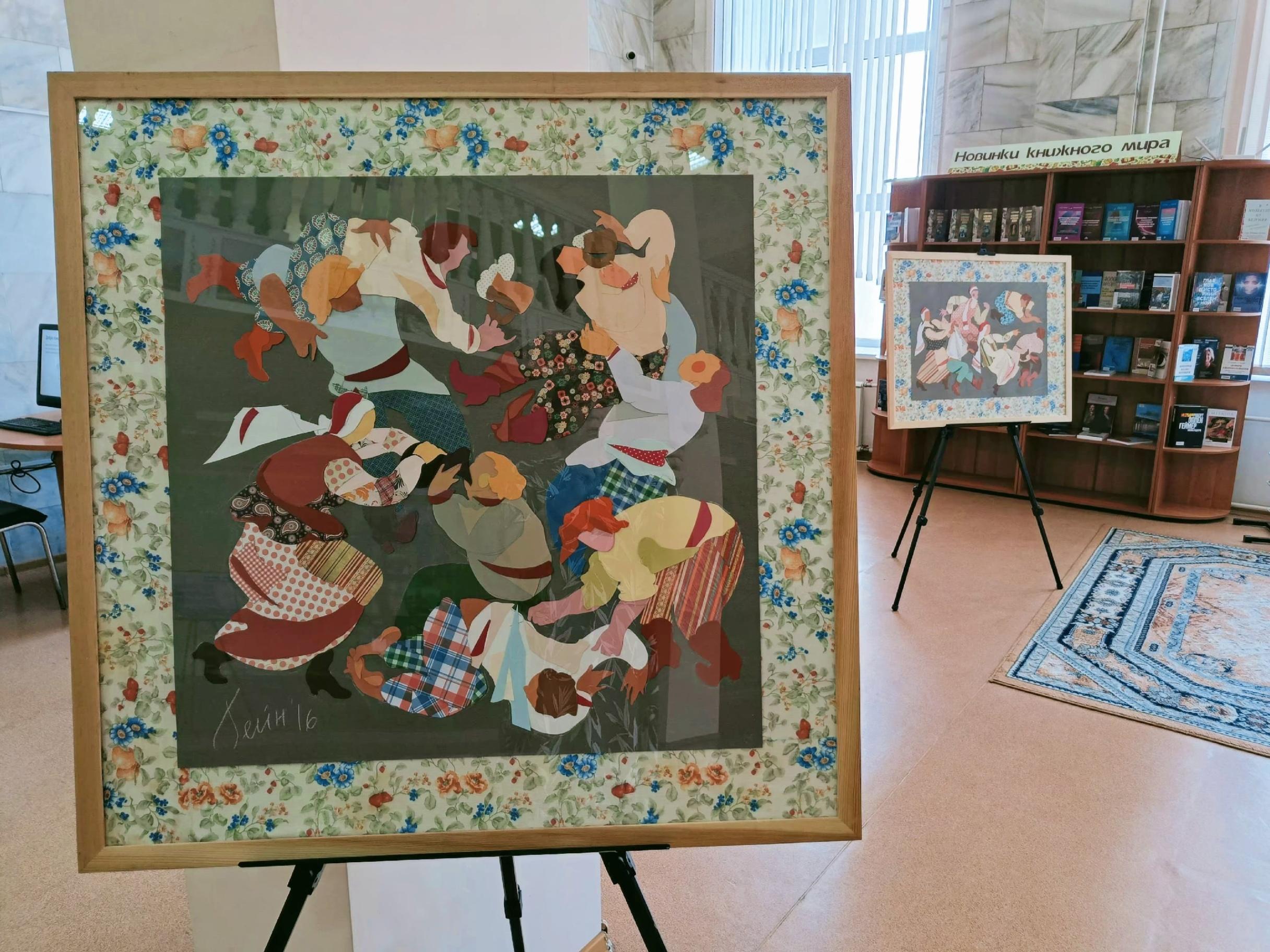 В колонном зале библиотеки представлены работы художника-графика Марии Евгеньевны Гейн. Это семь графических листов с изображением извечной темы – взаимоотношений новоявленных родственников. Работы выполнены на цветной бумаге в технике аппликации.