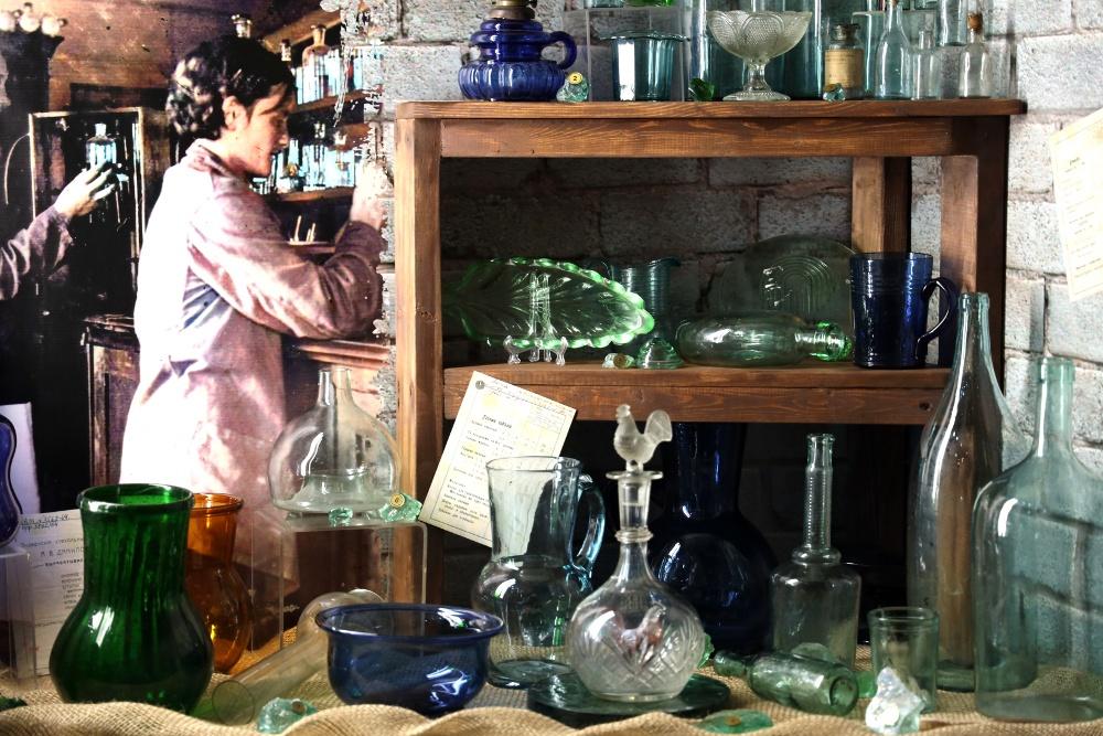 Выставка представляет коллекцию предметов и документов, рассказывающих об истории завода: кирпичи из стен цеха и печей, стеклянные куски разных оттенков зеленого, кварцевый песок и образцы продукции – графины, бутылки 1890-1900-х годов.