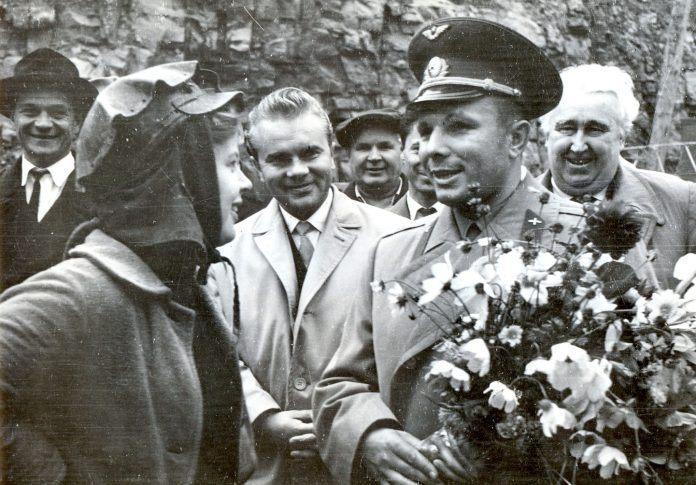 Красноярск встречал Ю. А. Гагарина 25 сентября 1963 года. Сначала Юрий Алексеевич побывал в Дивногорске, где велось строительство Красноярской ГЭС. Внес свою лепту в ее возведение: взял лопату и пару раз забросил бетон в тело плотины. В Красноярске в это время проходил слет молодых строителей Сибири и Дальнего Востока, организованный ЦК ВЛКСМ. Гагарин стал почетным гостем слета. Мероприятие проводили в театре музыкальной комедии, присутствовало больше тысячи человек. Космонавт вышел на сцену под шквал аплодисментов и выступил перед участниками.