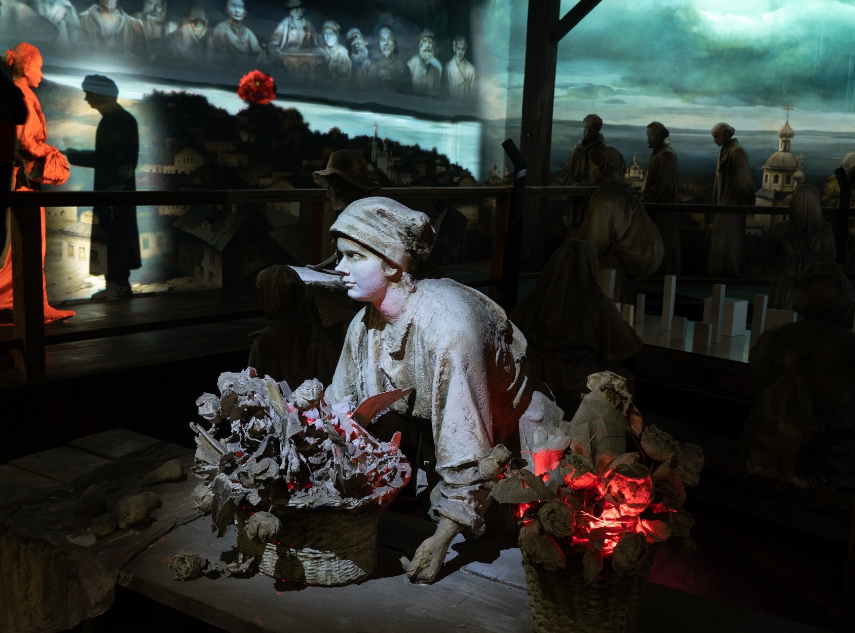 «Воскресение на площади» – это трансформированная диорама «Старая Россия», сохранившаяся в музее с 1987 года. На базарной площади сошлись представители начала XX века – нищие, торговки, жандарм, арестанты и рабочие, за спинами которых на заводе «зарождалась искра».